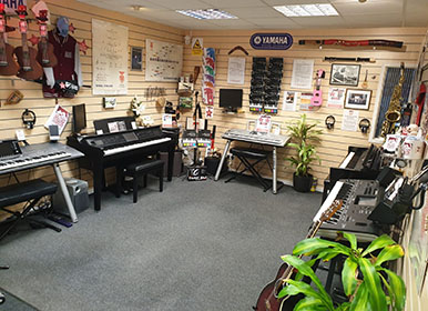 Studio 2 The second studio is our general music tuition room. Piano, Keyboard, Guitar and Drums all have allocated time slots. This modern equipped environment houses a computer, white board and many accessories to compliment your chosen instrument. Music books are available for all instruments with a vast selection including classical, jazz, big band, modern rock and pop. We have a selection of acoustic and electric guitars including amps, once again the studio uses the latest Piano and Keyboard instruments.