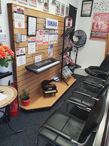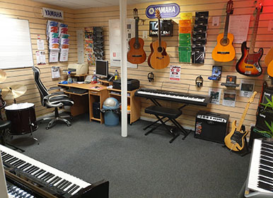 Studio 2 The second studio is our general music tuition room. Piano, Keyboard, Guitar and Drums all have allocated time slots. This modern equipped environment houses a computer, white board and many accessories to compliment your chosen instrument. Music books are available for all instruments with a vast selection including classical, jazz, big band, modern rock and pop. We have a selection of acoustic and electric guitars including amps, once again the studio uses the latest Piano and Keyboard instruments.